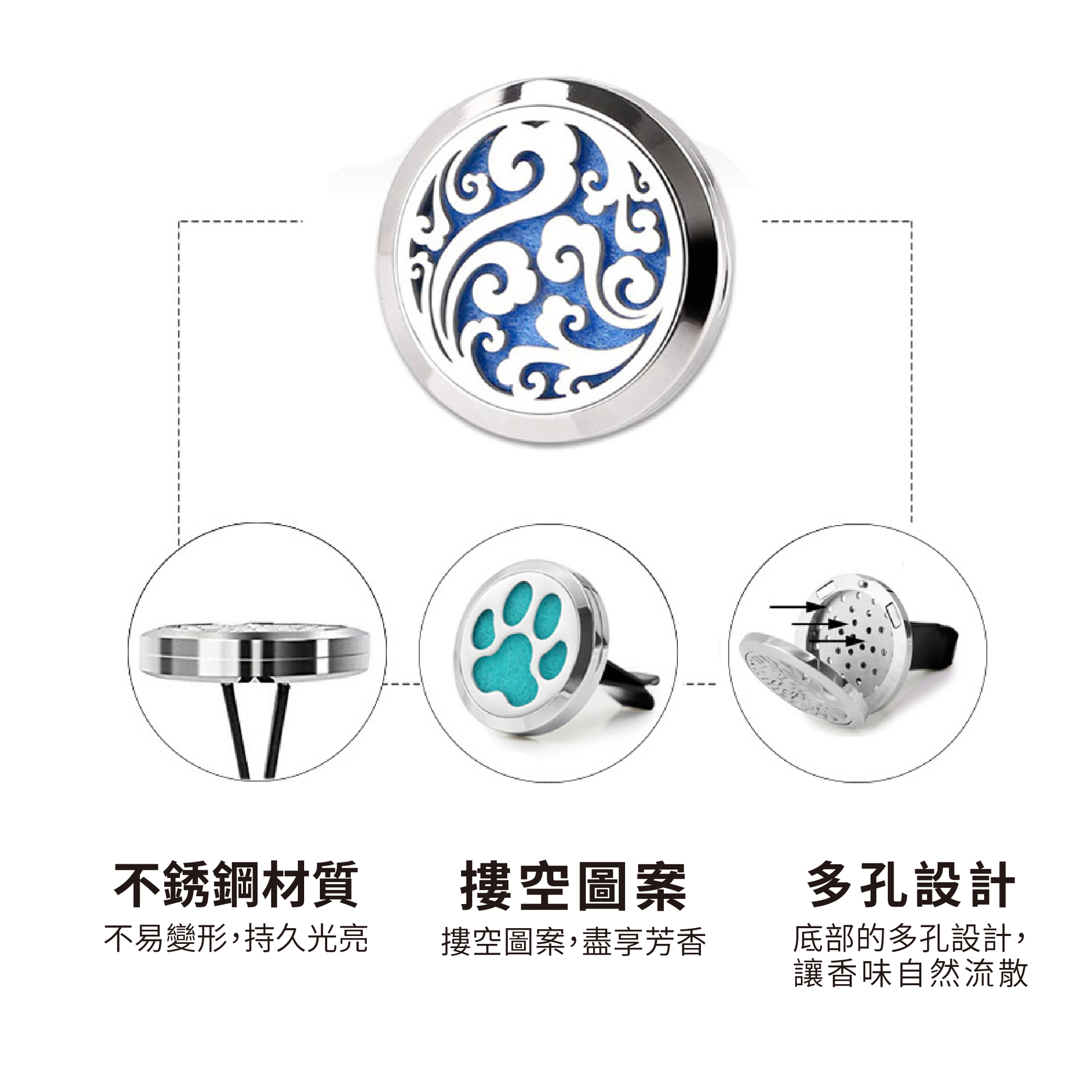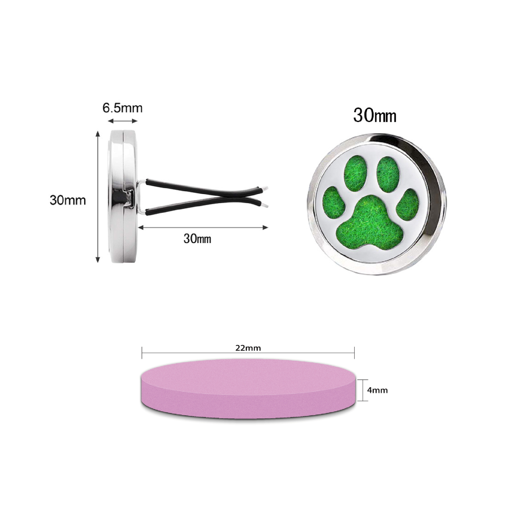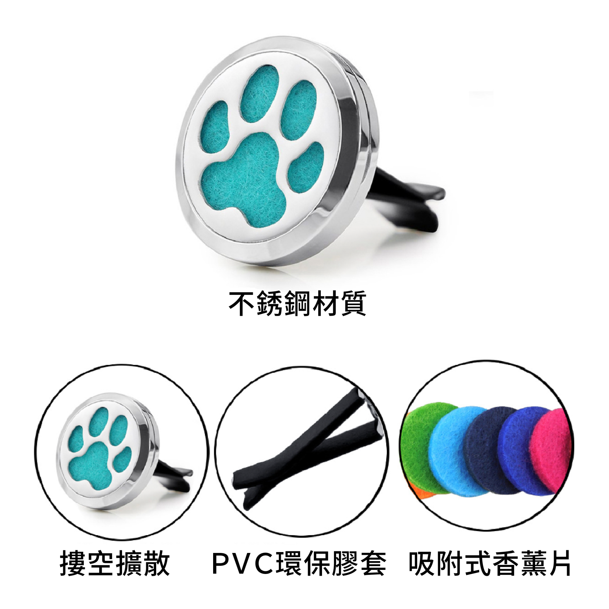 セット内容:アロマセラピークリップ 2 個、フェルト充填パッド 5 個、アロマセラピータブレット 2 個 (ランダムに含まれています)。